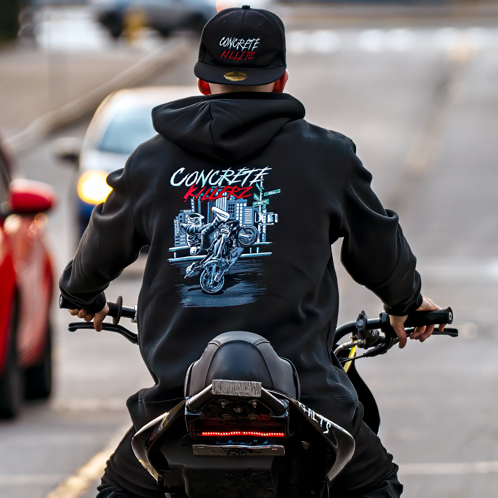 Pair it with the matching Concrete Killerz shirt for a complete look. Whether you're hitting the streets or just looking to represent your love for the thrill, the Concrete Killerz Hoodie is a statement.